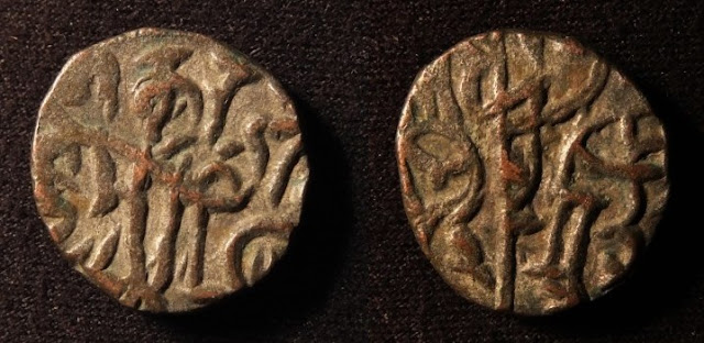 Silver jitals of the early period were sometimes accompanied by bronzes of similar size but bearing the images of an elephant and lion. While considerably less common than the silver, the most common bronzes are in the name of Samanta Deva. Coins are usually seen crudely struck which explains why I am showing two examples of the same type, each with different strengths. Again, as I find examples of other types, they will be added to this space but the number of Shahi bronzes available on the market even in the condition of those shown here is not high. There is almost no demand for them in the market so it is hard to know whether they are actually rare compared to the silver or just ignored by the trade.